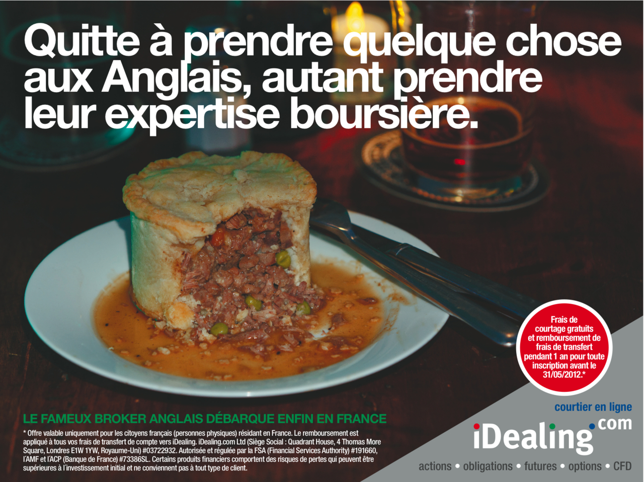 Peut-être avez-vous remarqué dans le métro parisien cette affiche qui incite d’abord au dégoût : un « meat pudding » traînant sur une sauce trouble virant à l’orange sur fond sombre et assorti du slogan « Quitte à prendre quelque chose aux Anglais, autant prendre leur expertise boursière ». Passée cette réaction épidermique, on se demande : quelle marque a accepté de dénigrer autant l’Angleterre pour se faire valoir ? Il s’agit d’IDealing, courtier en bourse britannique, qui se targue d’afficher les prix les plus bas sur le marché français depuis 2012. Drôle de stratégie que celle qui crache sur une partie de la culture de son pays pour en vanter les mérites dans un autre domaine ! La négation de ses racines n’a sans doute d’autre but que de s’accorder aux clichés français sur les Anglais pour mieux s’implanter sur ce nouveau marché. Comme le Français est très fier de sa propre gastronomie, pourquoi ne pas tenter le coup en dénigrant la cuisine anglaise !