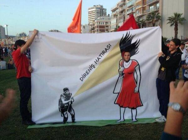 La contestation turque n’a pas de leader, mais elle a trouvé son icône. Ceyna Sungur, chargée de cours à l’Université technique d’Istanbul, incarne la jeunesse turque libre, éduquée et moderne, qui refuse la radicalisation de la société d’Erdogan. Elle symbolise la contestation liée à la crainte d’une dérive islamiste de la société. Nombre de manifestants dénoncent en effet les attaques du premier ministre Recep Tayyip Erdogan à l’encontre du droit des femmes (injonction à faire au moins trois enfants, restrictions imposées en matière d’avortement, port du voile). Max Fisher, journaliste au Washington Post, propose une analyse intéressante de la photo, dont voici un extrait : « La dynamique entre la femme en rouge et le policier sur la photo est fascinant, comme un microcosme qui montre la relation entre les Turcs révoltés et leur gouvernement, qu’ils perçoivent comme de plus en plus autoritaire. » Alors que les anti-Erdogan dénoncent depuis le début du mouvement la force de la répression menée à leur encontre, le cliché est devenu le symbole de cette brutalité.