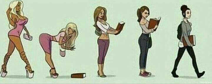 La réinterprétation qui en résulte met en scène une jeune femme arborant des attributs qui se veulent symboles de vulgarité et de superficialité (blondeur, formes généreuses, talons hauts, couleurs criardes, style dénudé) avant de tomber sur un livre et de se transformer au fil de sa lecture en une femme «respectable» – discrète, rhabillée et amincie.