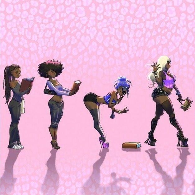 Les talons lui confèrent de la hauteur : elle domine. Ses formes lui donnent du poids : elle est légitime. Sa nouvelle démarche l’autorise à prendre de l’espace : elle est assurée. Elle revisite à son tour le scénario, faisant de l’objet livre, symbole de savoir, un outil de réappropriation féminine, et non un symbole de reconnaissance académique et sociale nécessaire à une réussite qui en dénigre ses manifestations. Elle souligne un discours sexiste et raciste qui lie les morphologies plantureuses et l’hyper-féminité à la superficialité et la vulgarité. En une image, elle pose les bases de son personnage et active un narratif clair à travers un fort ancrage dans la culture populaire et les codes d’Internet. L’histoire est d’autant plus percutante qu’elle résonne avec le parcours de Theodora, qui a suivi une prépa ENS avant de se consacrer à la musique. Ces raccourcis idéologiques qui confondent sensualité et frivolité, qui opposent l’intellectualité à la performance de la féminité, et qui s’appliquent plus généralement à décrédibiliser les femmes, Theodora s’applique à les déconstruire depuis plusieurs années.